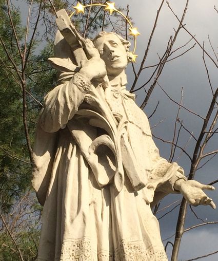 Sein Heiligenschein zeigt 5 Sterne, die als die 5 Buchstaben des lateinischen Wortes tacui - habe geschwiegen - gedeutet werden, da er das Beichtgeheimnis nicht gebrochen hat.