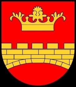 "In rotem Schild eine goldene, gefugte und mit fünf Zinnen versehene Brücke, überhöht von einer goldenen Blätterkrone."